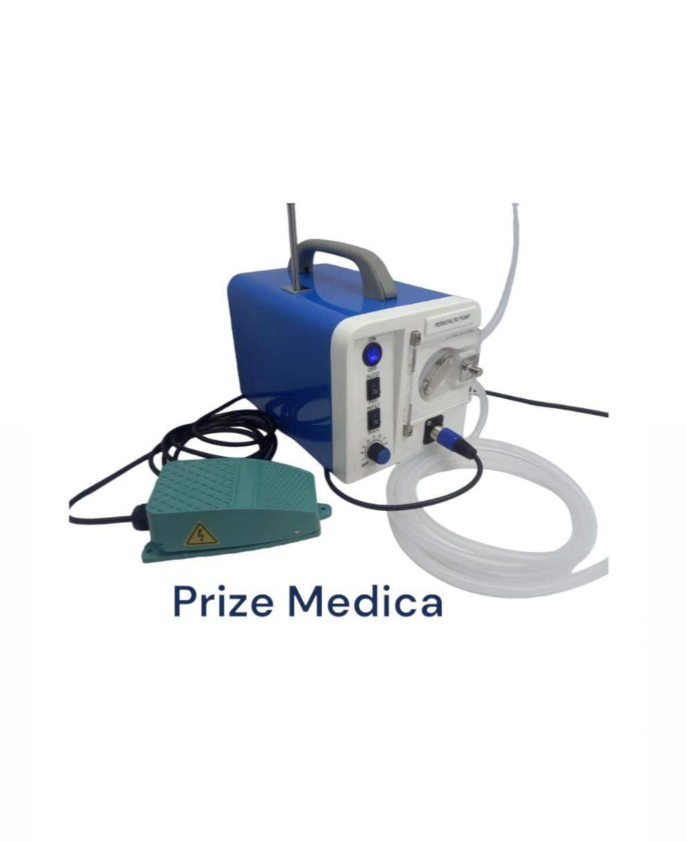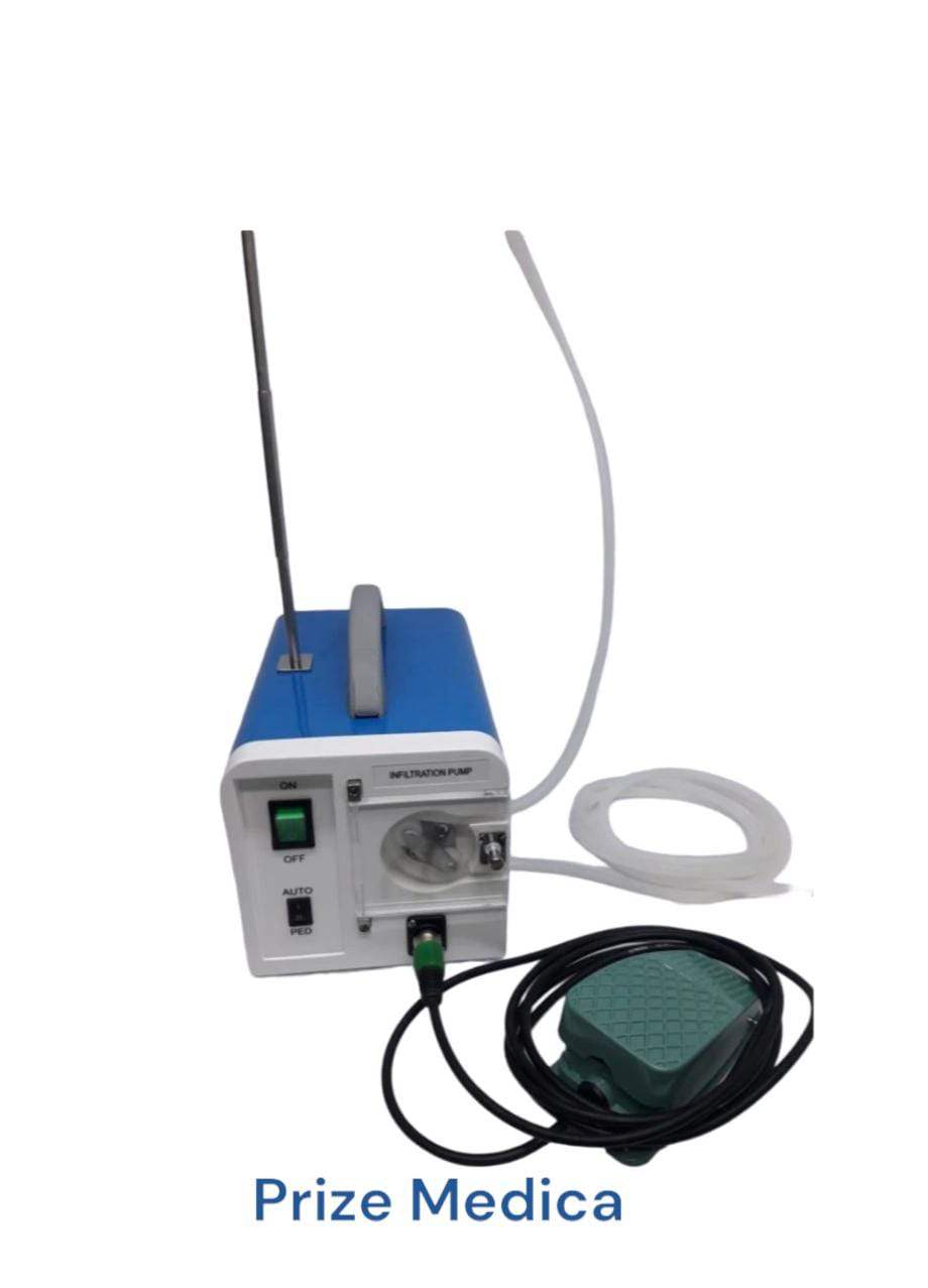 Fabricada en plástico reforzado y sus partes metálicas son en acero inoxidable, al ser compacta ( sin cierres móviles y ajustes para mangueras) es silenciosa y no presenta desajustes a través del tiempo. Marca Prize Medica. Está tiene una capacidad de infiltración de 0 a 800 cc por minuto y su mando, en el botón ON-OFF ( prendido-apagado), con velocidad variable.Voltaje: 110 - Consumo: 2.5 Amp Motor Tipo DC. Sus accesorios son: Pedal, Atril, 3 Metros de manguera siliconada grado medico para infiltrar y Un conector para suero en acero quirúrgico.
