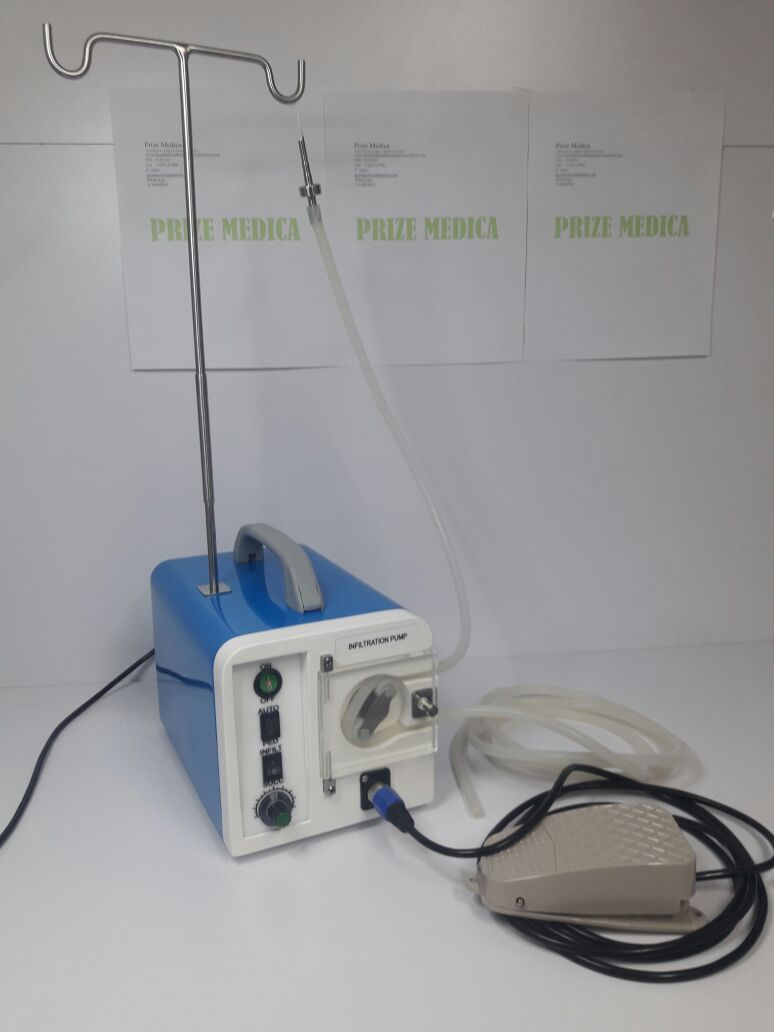 Fabricada en plástico reforzado y sus partes metálicas son en acero inoxidable, al ser compacta ( sin cierres móviles y ajustes para mangueras) es silenciosa y no presenta desajustes a través del tiempo. Marca Prize Medica. Está tiene una capacidad de infiltración de 0 a 800 cc por minuto y su mando, en el botón ON-OFF ( prendido-apagado), con velocidad variable.Voltaje: 110 - Consumo: 2.5 Amp Motor Tipo DC. Sus accesorios son: Pedal, Atril, 3 Metros de manguera siliconada grado medico para infiltrar y Un conector para suero en acero quirúrgico. Su garantía es de Un (1) Año a partir de la fecha de compra. Tipo de trabajo: Pesado